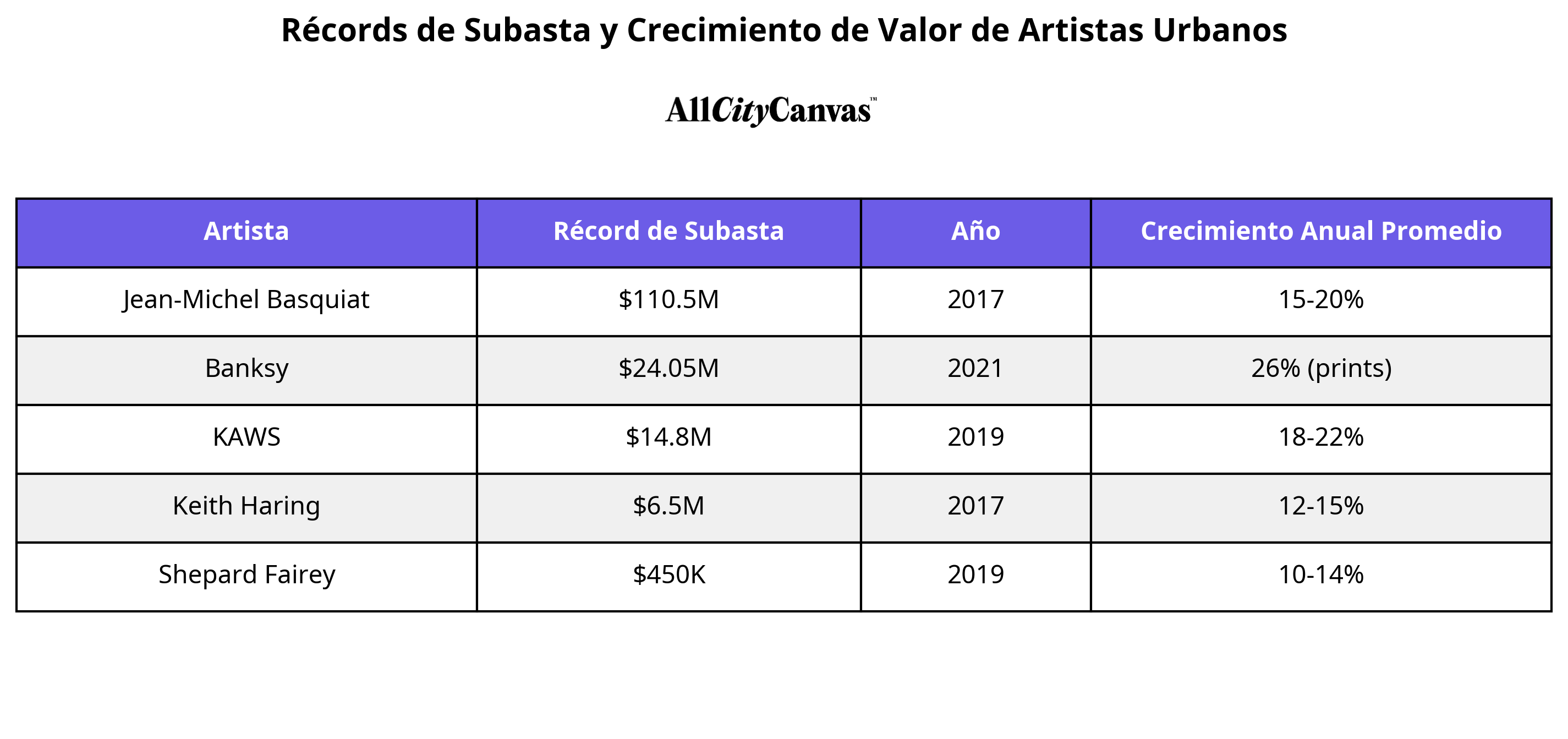 Shepard Fairey (Obey), conocido por su icónico póster “Hope” de Barack Obama, ha visto sus prints de edición limitada, que originalmente se vendían por 50-100 dólares, alcanzar miles de dólares en el mercado secundario. Incluso pioneros como Keith Haring y Jean-Michel Basquiat, ambos fallecidos hace décadas, continúan viendo aumentos en el valor de sus obras. En 2024, el volumen de negocio en subastas de Keith Haring aumentó un 22%, y una obra de Basquiat se vendió por 110.5 millones de dólares en 2017.