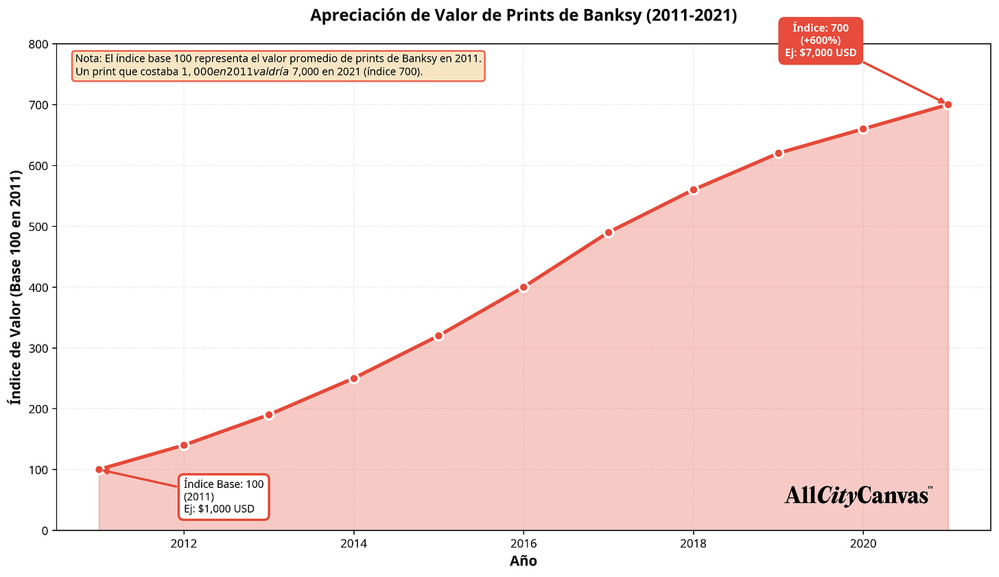 Banksy es el caso de estudio por excelencia. Sus obras han experimentado una apreciación de valor explosiva. Según datos de Sotheby’s y Artprice, el valor de sus prints aumentó más de un 600% entre 2011 y 2021. El ex-manager del artista ha llegado a calcular un retorno de la inversión del 260% en diez años, con un CAGR del 26% en sus prints de edición limitada.