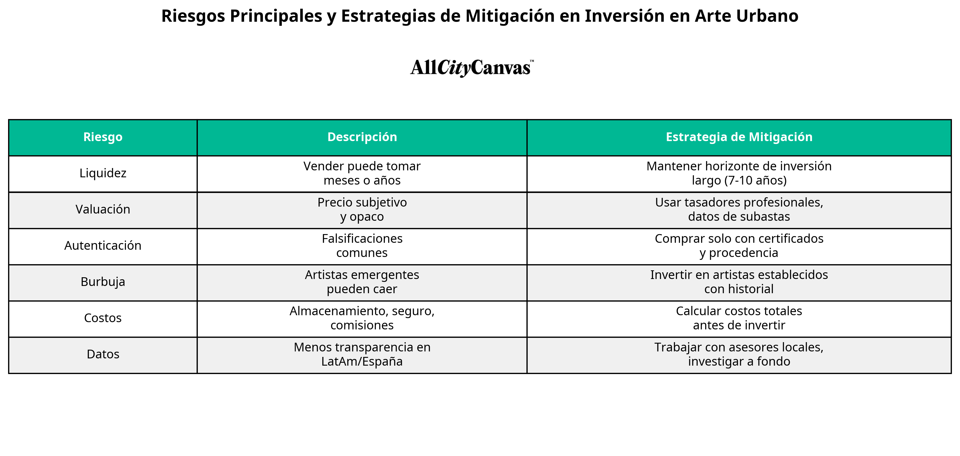 A pesar de su crecimiento, invertir en arte urbano no está exento de riesgos que los inversores deben considerar cuidadosamente.