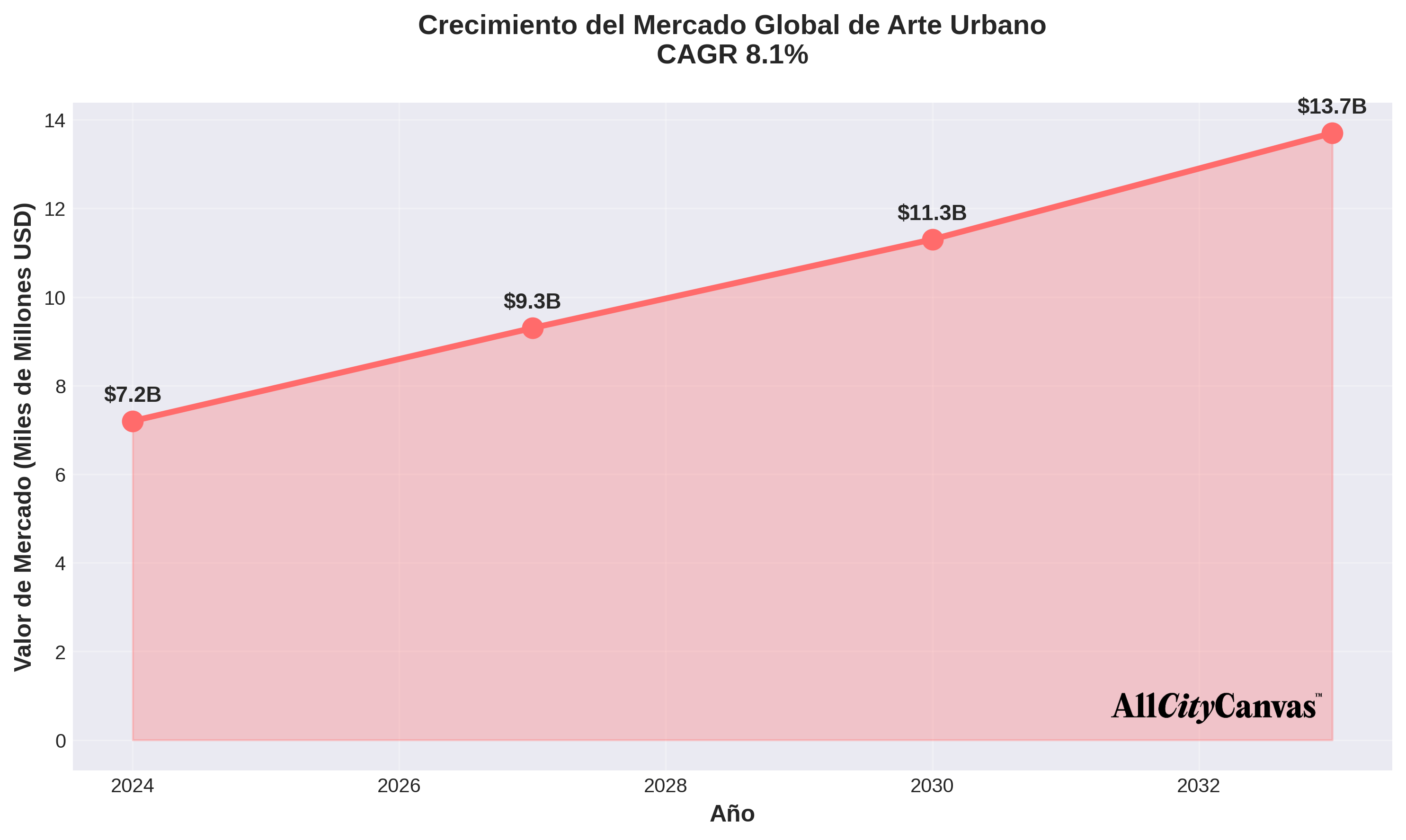 El mercado del arte urbano está experimentando una expansión sin precedentes. Según un informe de DataIntelo, el mercado global alcanzó un valor de 7.2 mil millones de dólares en 2024 y se proyecta que crezca a una tasa anual compuesta (CAGR) del 8.1%, alcanzando los 13.7 mil millones de dólares para 2033. Este crecimiento robusto supera al del mercado del arte en general, que crece a un CAGR del 3.1%, señalando un cambio estructural en las preferencias de coleccionistas e inversores.