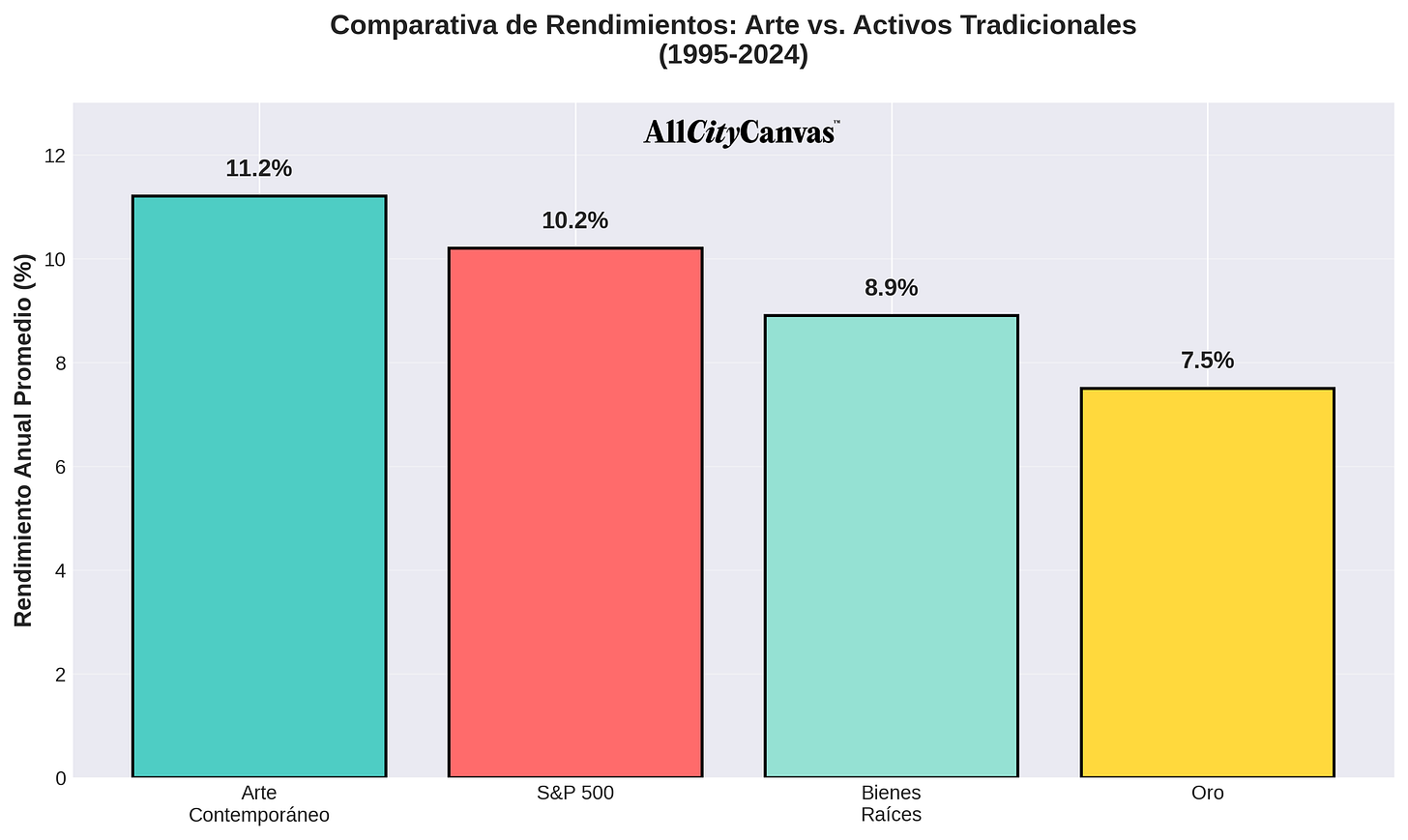 El atractivo del arte urbano como inversión se sustenta en un rendimiento que, en muchos casos, ha superado a los activos tradicionales. El arte contemporáneo en general ha demostrado ser una inversión sólida, con un rendimiento anual promedio del 11.2% entre 1995 y 2024, en comparación con el 10.2% del S&P 500, el 8.9% de los bienes raíces y el 7.5% del oro.