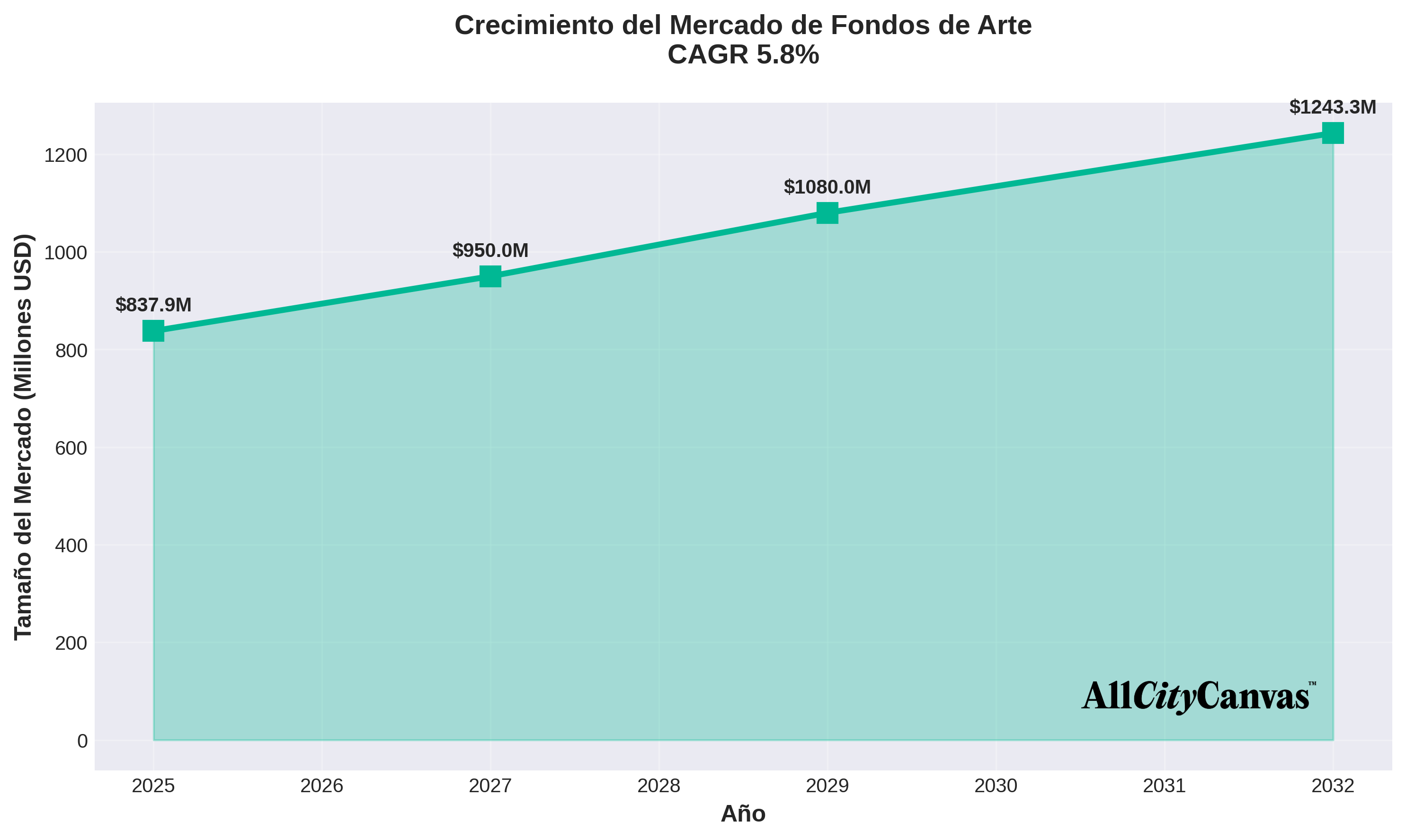 Los fondos de inversión en arte, que operan de manera similar a los fondos de capital privado, están ganando terreno. Según Coherent Market Insights, el mercado de los fondos de arte se valoró en 837.9 millones de dólares en 2025 y se espera que alcance los 1,243.3 millones para 2032, con un CAGR del 5.8%. Estos fondos agrupan capital de inversores para adquirir carteras diversificadas de obras de arte, gestionadas por expertos con conocimiento profundo del mercado.