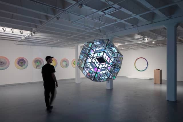Justo hace unos meses finalizo en Los Ángeles, OPEN en The Geffen Contemporary at MOCA, su primera gran exposición en la ciudad. Fue una serie de dispositivos ópticos que respondieron tanto a la arquitectura industrial del edificio como a las condiciones atmosféricas específicas de California, ese estado perpetuamente en llamas donde el clima ya no era telón de fondo sino protagonista ineludible de la experiencia cotidiana. Caleidoscopios gigantes, torres de observación construidas con materiales reciclados, sombras de colores que cambiaban según la posición del espectador en el espacio, máquinas de dibujo que traducían datos meteorológicos en composiciones visuales que cambiaban cada día. Todo fue diseñado para que los visitantes cuestionaran lo que creían saber sobre el acto simple y complejo de ver, de estar en el mundo, de compartir espacio con otros cuerpos bajo un cielo que cada año se volvía más impredecible.