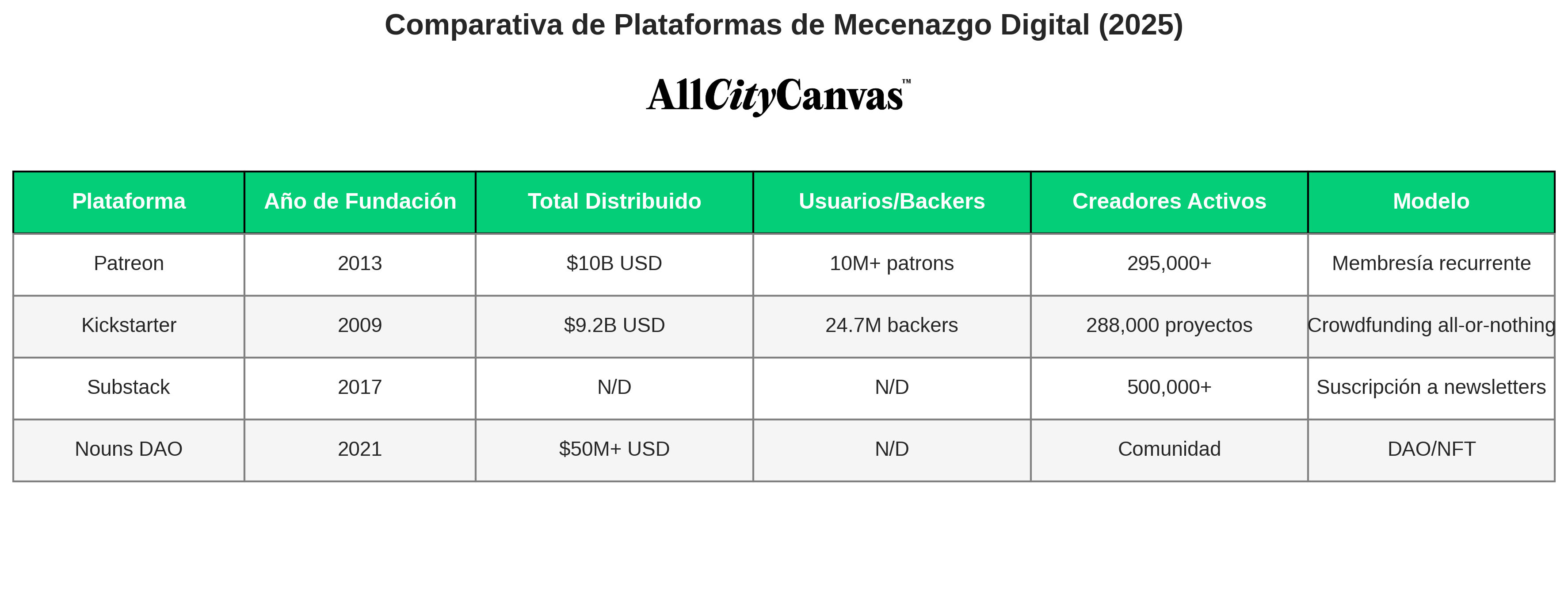 Patreon, fundada en 2013 por el músico Jack Conte, ha distribuido más de 10 mil millones de dólares a creadores desde su lanzamiento. Con más de 10 millones de “patrones” activos y 295,000 creadores con al menos un miembro pagador, Patreon ha demostrado que el modelo de membresía recurrente es viable para artistas, músicos, podcasters y escritores. La plataforma distribuye actualmente más de 2 mil millones de dólares anuales a creadores, con un crecimiento del 150% desde 2020.