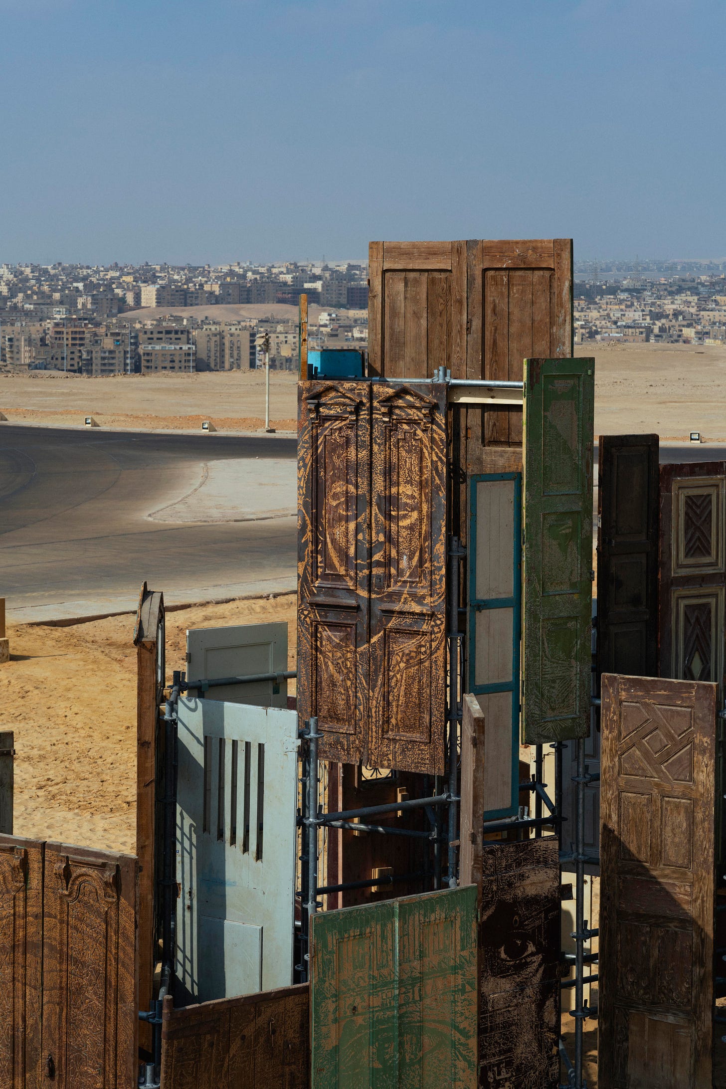 Las puertas que componen la instalación provienen de contextos diversos dentro del tejido urbano cairota. Algunas fueron rescatadas de casas en demolición, otras de negocios cerrados, otras de espacios en medio de procesos de renovación urbana que implican la sustitución total de elementos arquitectónicos originales. Cada una cumplió durante años una función específica: separar el espacio privado del público, regular el acceso y la exclusión, proteger lo que quedaba del otro lado, enmarcar encuentros y despedidas. Las puertas son los objetos arquitectónicos de la intimidad doméstica y comercial, los umbrales donde lo personal y lo colectivo se tocan sin mezclarse completamente. Vhils las arranca de ese contexto funcional y las recontextualiza en el desierto, donde pierden su utilidad literal para ganar densidad simbólica. Ya no abren ni cierran nada, pero se convierten en portales temporales, en umbrales entre pasado y presente, en superficies donde la memoria individual y colectiva se vuelve visible.