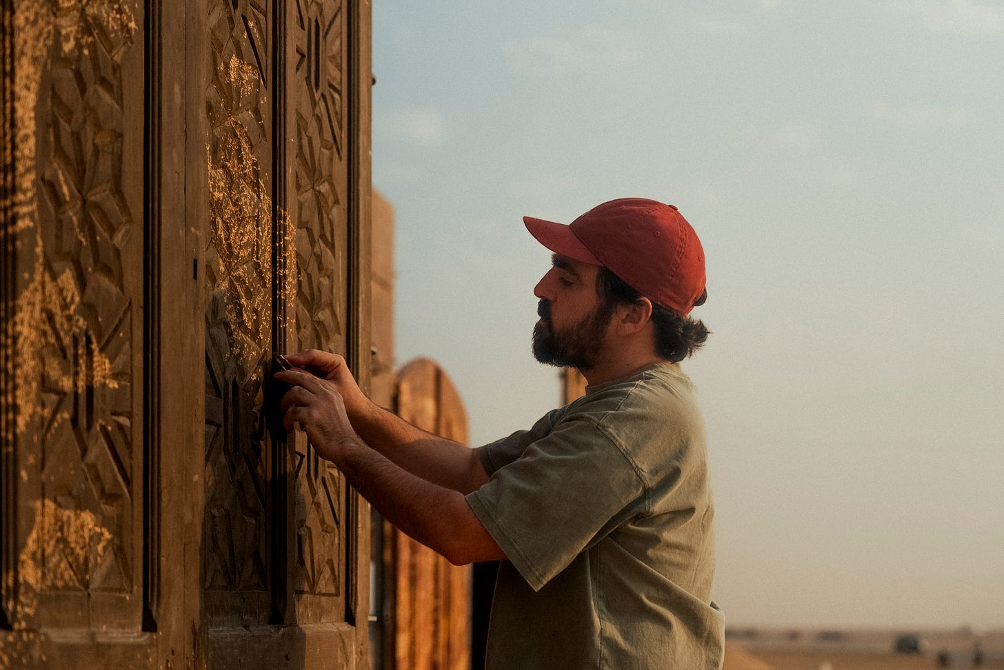 El tallado que Vhils aplica a cada puerta responde a un método que lleva perfeccionando desde sus inicios en el graffiti y el muralismo urbano. Su técnica se basa en la sustracción material: quitar, erosionar, excavar, revelar lo que está debajo de la superficie. Cada golpe de cincel o herramienta eléctrica expone capas de pintura acumuladas, vetas de madera ocultas durante décadas, texturas que el uso diario había aplanado. Los rostros que emergen en las puertas talladas son síntesis de identidad colectiva, rostros que podrían pertenecer a cualquiera, que representan a todos los que alguna vez cruzaron esas puertas sin saber que un día terminarían convertidas en escultura pública frente a las pirámides. Hay patrones ornamentales que evocan la artesanía tradicional egipcia, referencias visuales a la historia del diseño local, gestos formales que conectan con la iconografía histórica sin copiarla directamente.