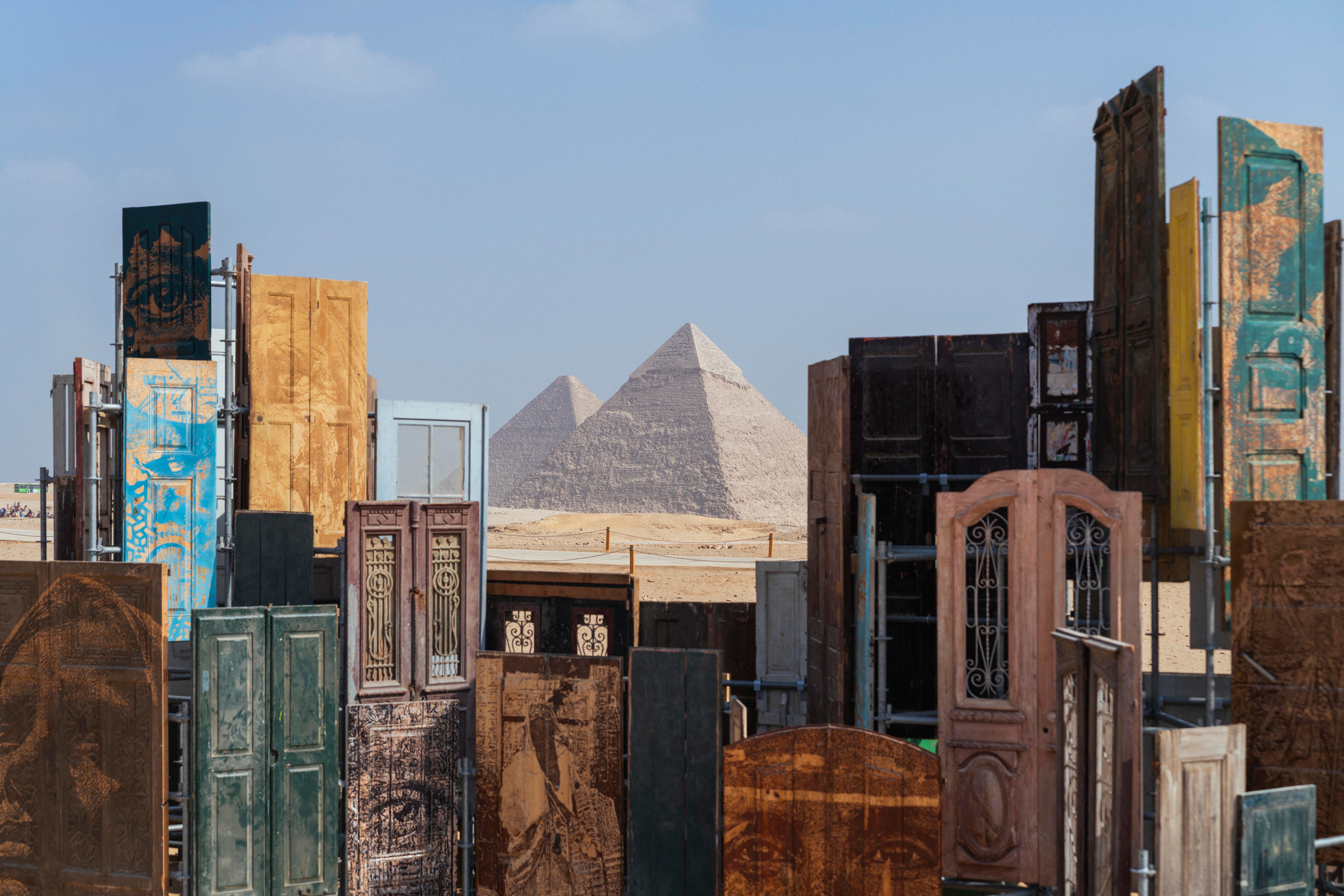 Forever Is Now corre hasta el 7 de diciembre de 2025, lo que significa que cientos de miles de personas pasarán por la instalación durante el próximo mes. Algunos llegarán específicamente para ver las obras de arte contemporáneo, otros llegarán como turistas interesados principalmente en las pirámides y encontrarán las instalaciones como sorpresa contextual. Ambos tipos de público experimentarán el mismo encuentro físico con “Doors of Cairo”: una estructura vertical de puertas talladas plantada en el desierto, cargada de memoria cairota, dialogando silenciosamente con la monumentalidad faraónica del fondo.